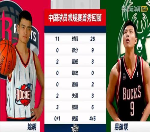 2005年11月2日 雄鹿 对阵 山猫,易建联首秀首发出战26分钟, 5投4中贡献9分、1次抢断和3个篮板,这也是中国球员在NBA首秀的得分纪录。