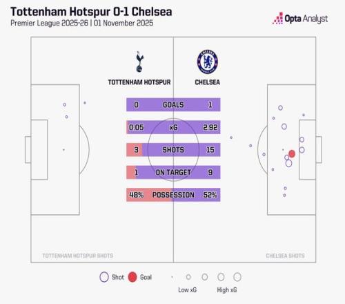 与切尔西一役预期进球仅0.05,为有统计以来热刺英超单场最低